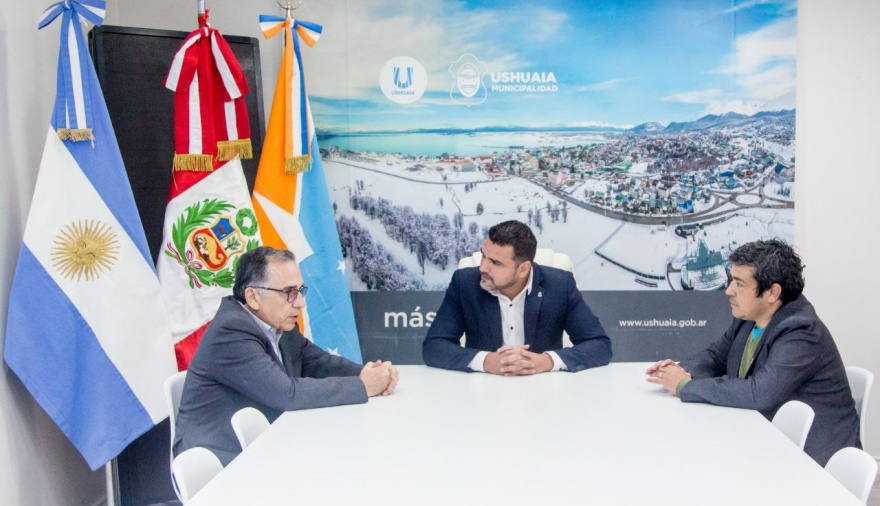 El Intendente de Ushuaia Walter Vuoto recibió al Embajador Extraordinario y Plenipotenciario de Perú en Argentina, Carlos Alberto Chocano Burga, y le entregó presentes en nombre de la ciudad acompañado del jefe de Gabinete Sebastián Iriarte. Coincidieron en la importancia de fortalecer el trabajo en conjunto entre la ciudad de Ushuaia y el país hermano en materia de intercambio cultural y turístico y el desarrollo de proyectos económicos y comerciales. Remarcaron que la cooperación entre Ushuaia y Perú tiene un enorme potencial, y afirmaron que continuarán trabajando juntos para aprovecharlo al máximo.