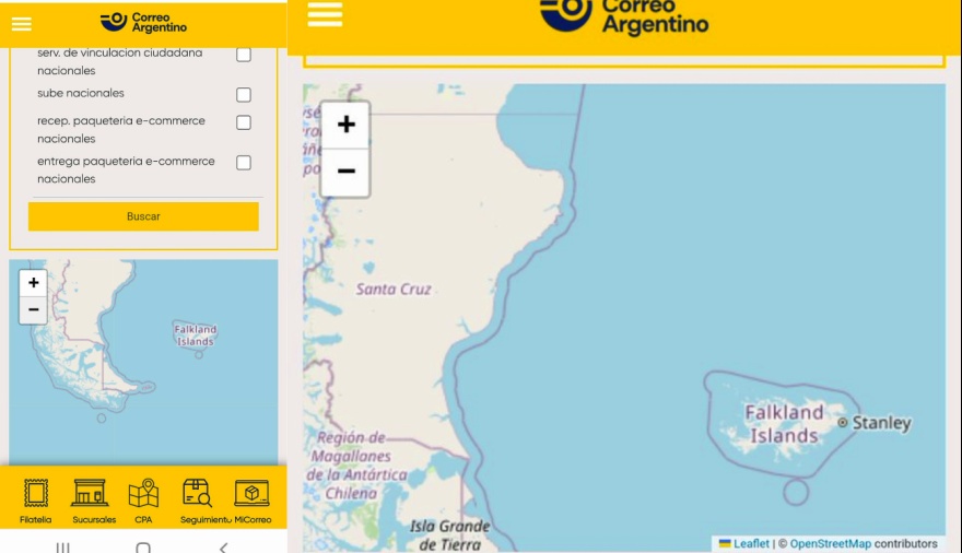 En la página del Correo Argentino, específicamente en el apartado de Sucursales, las Islas Malvinas figuran como “Falkland Islands” y Puerto Argentino como “Stanley”. Lo insólito de esa denominación, que viola una ley nacional, fue denunciado por varios usuarios de redes sociales. En todos los casos, reclamaron la corrección de esa publicación, que atenta con el histórico reclamo argentino de soberanía sobre el archipiélago.