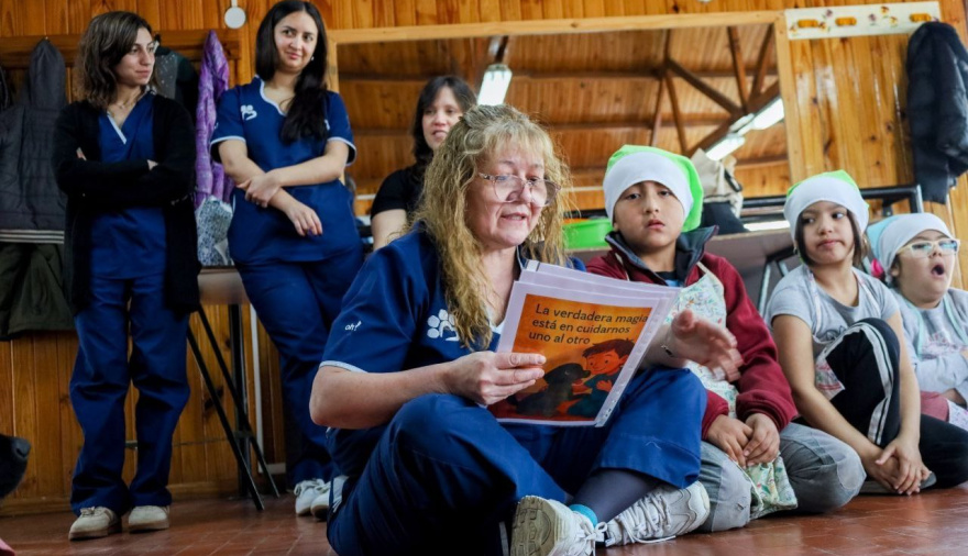 La Secretaría de Cultura y Educación de la Municipalidad de Ushuaia, a través del programa Hábito Lector: Cocineritos, Cuentos y Relatos, llevó adelante en la sede comunal del barrio Felipe Varela una jornada de lectura y cocina y mucha diversión junto a Martín y Eddie. La propuesta contó con la participación del equipo de Terapia Asistida con Perros (TAP) de la Secreatría de Políticas Sociales, Sanitarias y DDHH de la Municipalidad de Ushuaia. El objetivo de la propuesta fue promover el hábito de la lectura a partir de un cuento especialmente escrito para la ocasión por Alicia Mansilla, arteterapeuta del Equipo TAP, cuyos protagonistas fueron precisamente Martín y Eddie. Su presencia generó un clima de confianza, alegría y colaboración, reafirmando su rol como facilitadores del vínculo y la comunicación. Tras la narración, los chicos y chicas elaboraron galletas saludables para perros con ingredientes muy particulares: amor, ternura, esperanza, amistad y unión. Cada paso fue concebido como un puente entre la lectura, la creatividad y el fortalecimiento del vínculo afectivo con los animales. Belén Molina, secretaria de Cultura y Educación, subrayó “la importancia de contar con un Estado Municipal que impulsa políticas públicas integrales para las infancias vinculadas a la lectura, el juego y la construcción de comunidad, llevando el Estado a cada barrio con iniciativas que integran saberes, afectos y derechos”. Yanira Martínez secretaria de Políticas Sociales, Sanitarias y DDHH agregó "El Equipo de Terapia Asistida con Perros continúa demostrando que la ternura y el vínculo humano-animal son herramientas valiosas para acompañar a las infancias, especialmente a las más vulnerables, en sus procesos de socialización, aprendizaje y bienestar emocional. Iniciativas como esta invitan a pensar la educación desde un enfoque sensible, creativo y transformador, donde leer, cocinar, jugar y cuidar son también formas de aprender a habitar el mundo con otros." Por último José Luis Paredes, subsecretario de Promoción Educativa, destacó que “desde el programa de Hábito Lector, seguimos impulsando espacios inclusivos y participativos que acercan oportunidades, promueven valores y acompañan el crecimiento de nuestras infancias en entornos cuidados y con presencia estatal, contando en esta ocasión con una jornada distinta donde chicos y chicas pudieron interactuar con el equipo de TAP”.