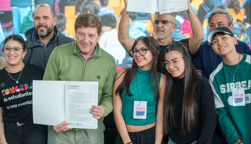 El Gobernador Gustavo Melella encabezó el cierre del Congreso Provincial de Estudiantes en la ciudad de Tolhuin, luego de llevarse a cabo encuentros multitudinarios en Ushuaia y Río Grande. Al finalizar el encuentro, las y los estudiantes hicieron entrega al Mandatario de las conclusiones y propuestas trabajadas, con lo que luego se desarrollará un documento que formará parte del proceso de la Transformación Educativa de la provincia. El Gobernador estuvo acompañado por el ministro Jefe de Gabinete, Agustín Tita, del ministro de Educación de la provincia, Pablo López Silva, Legisladores provinciales, Concejales de Tolhuin, y demás autoridades provinciales. En cada una de las ciudades el evento se desarrolló a través de una agenda de trabajo de exposición de ponencias según los ejes abordados ya en los Pre Congresos: “La escuela que tenemos”, “La escuela que queremos” y “Construyendo hacia el futuro”, como también se disfrutó de una variedad de presentaciones artísticas y musicales. Al respecto, el Gobernador Gustavo Melella recordó que “se vivieron tres jornadas de propuestas claras, precisas y muy concretas, donde nuestros estudiantes manifestaron qué necesitan y qué escuela secundaria desean”. “Agradecemos a las y los docentes que estuvieron acompañando a nuestros estudiantes por su gran gesto de compromiso. Cuando creamos espacios de trabajo y escucha con nuestros estudiantes surgen grandes propuestas y nuestro compromiso es trabajar para que estas propuestas sean una realidad, no una utopía”, añadió. “Estamos convencidos que la transformación será posible si aprendemos a escuchar a nuestros estudiantes y construir un camino, un recorrido que vaya dando respuestas”, concluyó el Gobernador. Por su parte, el Ministro de Educación, Pablo López Silva, agregó que “estamos orgullosos del trabajo de cada estudiante quienes son parte de esta transformación educativa poniendo su voz. Estos Congresos fueron una construcción de meses de trabajo en cada institución educativa para que realmente las voces de ellas y ellos sean escuchadas”. El Congreso se desarrolló en primera instancia en la ciudad de Río Grande reuniendo a más de 1.200 estudiantes secundarios. Luego continuó en la ciudad de Ushuaia con más 700 chicos y chicas y finalmente cerró en la ciudad de Tolhuin, reuniendo a grupos de estudiantes de las tres ciudades. En las tres ciudades se contó con stands con diferentes propuestas lúdicas y educativas, uno de Asesoría para Adolescentes del Ministerio de Salud, otro de propuestas académicas desde la Secretaría de Políticas para las Juventudes y una Sala de Escape. Además, las y los estudiantes realizaron la bandera del Congreso.