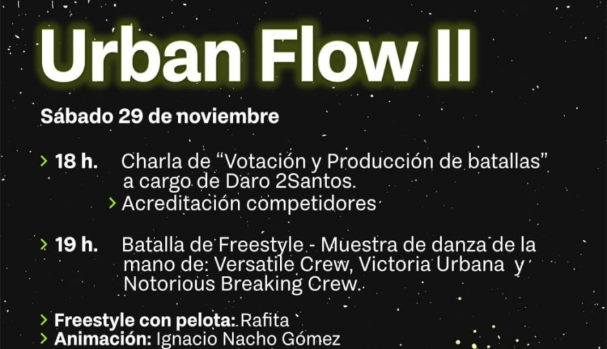 La Agencia de Innovación de la Provincia anunció la realización de la segunda edición de Urban Flow, un espacio que impulsa la creatividad, el movimiento y las expresiones artísticas propias de la comunidad urbana. El evento se llevará a cabo en la ciudad de Río Grande, el sábado 29 y domingo 30 de noviembre, en el Centro Cultural Yaganes (Av. Belgrano 319). Durante ambas jornadas, jóvenes de toda la provincia podrán ser parte de competencias, clases, intervenciones y propuestas culturales vinculadas a la escena urbana. En esta edición, Urban Flow contará con la presencia de destacados artistas nacionales. Entre ellos, Daro 2santos, quien brindará una charla sobre “Votación y Producción de Batallas” y será parte del jurado en las competencias. También participará la reconocida bailarina Jopy Mantegani, a cargo de una clase especial de Street Dance. A lo largo del fin de semana, se sumarán además artistas y crews locales que forman parte activa de la cultura urbana fueguina, entre ellos: Killo, Dj Fanton, Ignacio Gómez, 1007, Mono Wario, Mowgang, Rafita, Geo, José Miranda, Versatile Crew, Victoria Urbana y Notorius Breaking Crew. El evento será transmitido en vivo a través del canal de YouTube de Urvox TV, productora fueguina dedicada a la difusión de contenidos de la escena local. Además, habrá stands de emprendimientos vinculados al arte urbano y propuestas gastronómicas. Las actividades comenzarán el sábado 29 de noviembre a las 18 h., con entrada libre y gratuita. Inscripciones: Talleres: https://forms.gle/TXNyAL8qpyhezuW96 Charla “Votación y Producción de Batallas”: https://forms.gle/dYiuTaGEwWMR2z4u9 Para más información, se pueden consultar las redes sociales de Conocimiento TDF.