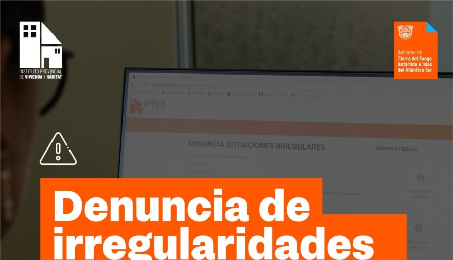 El Instituto Provincial de Vivienda y Hábitat (IPVyH) recuerda a la población en general que se encuentra a disposición un portal de denuncias anónimas en la página oficial del organismo www.ipvyhtdf.gob.ar sección “Realizá tu Denuncia”, a los fines de poner bajo conocimiento de la institución situaciones de ocupación irregular de las viviendas oportunamente adjudicadas.