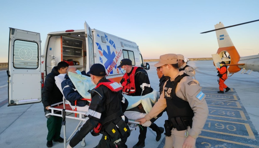 Una vez que la aeronave se ubicó sobre el buque, se descendió una canasta sanitaria y se izó al tripulante, quien recibió las primeras atenciones a bordo del helicóptero, mientras en tierra se coordinaba el arribo de una ambulancia al aeropuerto de Trelew.